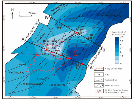 Heat flow contribution of sedimentary layers, basement depth and Moho depth in the Xiong’an area. WL well was outside the BB’ section.
