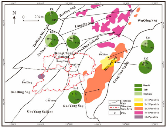 - Jin, C.S.; Qiao, D.W.; Dan, W.N. Meso-Cenozoic volcanic rock distribution and reservoir characteristics in the Bohai Bay Basin. Oil Gas Geol. 2012, 33. [Google Scholar] [CrossRef]