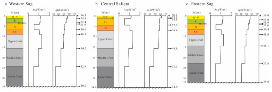 We calculated the thermal contribution of sedimentary layers in the study area based on the weighting of the rock composition (Table 3 and Table 4) with an average heat production of 0.81–1.06 μW/m3. This is in line with the upper limit of crustal heat production in mainland China of 1.3 μW/m3 proposed by Wang et al. [51]. The sedimentary layer heat production was the largest in the western sag at up to 7.98 mW/m2, whereas in the central salient and eastern sag it was 5.19–6.36 and 6.82–7.76 mW/m2, respectively, with respective contributions of 13.02%, 6.94–9.68%, and 11.88–14.21% in the western sag, central salient, and eastern sag.