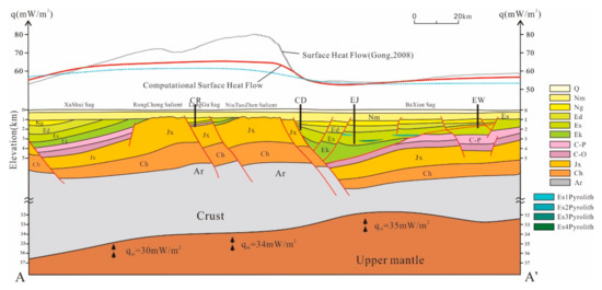 The calculated conductive terrestrial heat flow of AA’ section passing through the Xushui sag, Rongcheng salient, Niutuozhen salient, and Baxian sag. qm is the mantle heat flow of different tectonic areas calculated in previous studies. The gray heat flow line is geothermal flow by Gong [40] and red heat flow line is calculation conductive terrestrial data based on mantle heat flow, moreover, the blue heat flow line is obtained by assuming that the mantle heat flow was constant as 32 mW/m2.