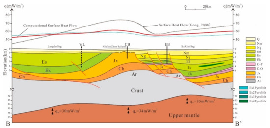 The calculated conductive terrestrial heat flow of BB’ section passing through the Langgu sag, Niutuozhen salient, and Baxian sag. qm is the mantle heat flow of different tectonic areas calculated in previous studies. The gray heat flow line is geothermal flow by Gong [40] and red heat flow line is calculation conductive terrestrial data based on mantle heat flow, moreover, the blue heat flow line is obtained by assuming that the mantle heat flow was constant as 32 mW/m2.