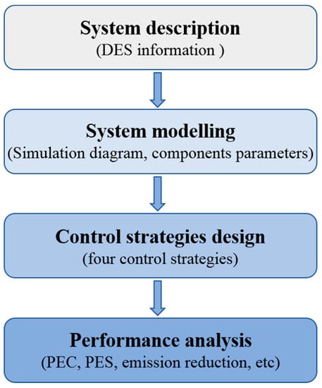 The method to assess the performance of DES is shown in Figure 1. Firstly, DES is introduced. Then, models of DES are established, and four control strategies are proposed. Finally, performance analysis is conducted considering energy, economy, and environment based on several evaluation indicators such as energy consumption, PES, operation cost, and emission reduction, and the results of which are compared with respect to a conventional energy system. Parameters are studied in terms of solar fraction and the soil annual heat imbalance rate.