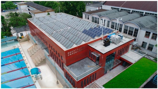 This study explores a DES at the Renewable Energy Demonstration Centre in Changsha as the case study. The DES is located in a hot summer and cold winter climate zone in southeast China. The Renewable Energy Demonstration Centre is shown in Figure 2. This project is a public indoor swimming pool built in a one-floor building. The building includes a flat roof with a height and area of 6.61 m and 1143 m2, respectively. The indoor swimming pool has a total surface area and volume of 450 m2 and 540 m3, respectively. The running time is from 10:00 to 22:00. According to the provisions of the Chinese standard [], the temperature of public indoor swimming pool should be in the range of 26–28 °C. The space temperature should be set 2 °C higher than the pool temperature, and the relative humidity should be maintained between 55% and 65%. The pool temperature and the indoor relative humidity under investigation are fixed at 27 °C and 60%, respectively.