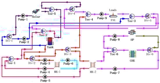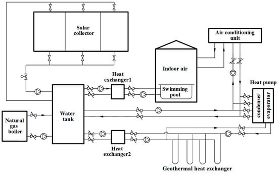 A simplified layout of the system is shown in Figure 3. The DES in this study mainly consists of a solar collecting system, geothermal heat pump system, heat storage water tank, heat exchangers, swimming pool, air conditioning unit, and water circulation system.