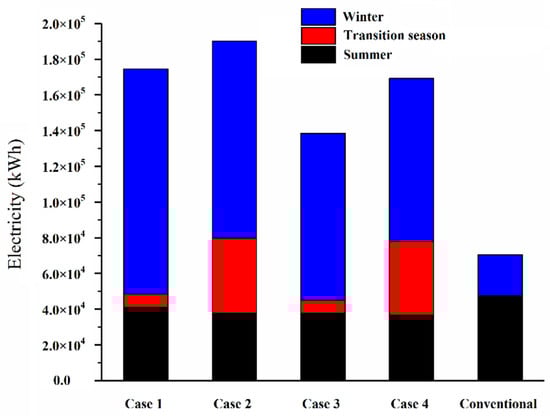 The electricity consumption of different cases is reported in Figure 5. The annual electricity consumption of cases 1, 2, 3, and 4 and the conventional energy system are 1.74, 19.0, 13.8, 16.9, and 7.0 × 104 kWh, respectively. The annual electricity consumption of DES is higher than that of the conventional energy system due to the added components for renewable energy utilization.