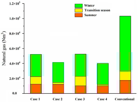 In the conventional energy system, the highest natural gas consumption occurs during winter (7.35 × 104 Nm3) and accounts for 71.20% of the annual consumption of natural gas. In DES, the major seasonal consumption of natural gas under different cases occurs in winter. The natural gas consumption of different cases tends to be in the steady state during summer. In the transition season, the natural gas consumption of cases 1 and 3 is close to that of the conventional energy system. The natural gas consumption of cases 2 and 4 is lower than that of other cases. The heat pump is the applied thermal energy to the water tank in cases 2 and 4. The natural gas consumption decreases as the electricity consumption increases due to the heat applied to the water tank provided by the heat pump in the transition season.