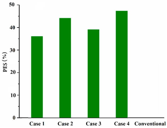 PES is shown in Figure 7. Compared with the conventional energy system PES values of cases 1 to 4 are 36.70%, 44.92%, 39.72%, and 48.04%. The result reveals that DES obtains better energetic performance than the conventional energy system due to the use of the renewable energy. PES is sensitive to the control strategy. The highest and lowest PES values are obtained by cases 4 (48.04%) and 1 (36.70%), respectively. Therefore, the control strategy of case 4 is the best amongst the cases. The aforementioned findings suggest that the use of renewable energy and control strategies is crucial in the energy performance of DES.