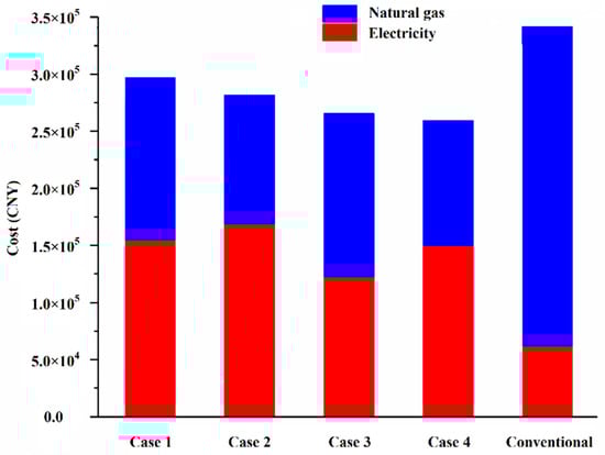Operation cost performance is an important indicator in a system. The costs (i.e., natural gas and electricity costs) of the four cases are compared in this section and shown in Figure 8.