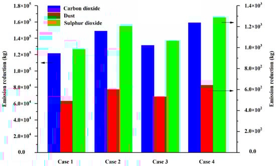 Emission reduction values of the four cases are discussed in this section, including reduction of CO2, SO2, and dust. The emission reduction values of the four control strategies are calculated on the basis of Equation (3). Figure 9 shows the emission reduction.