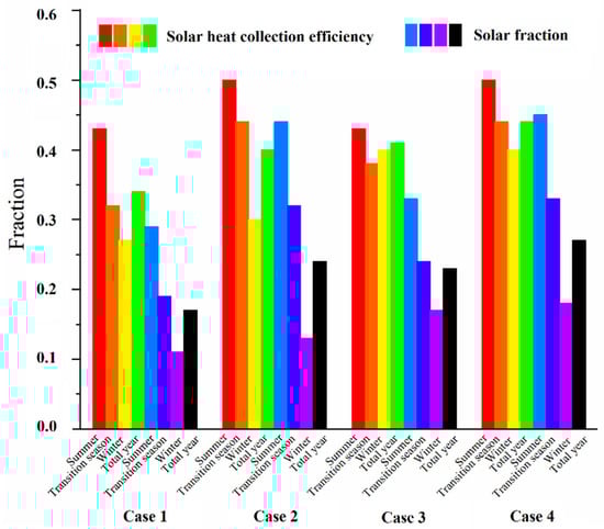 The solar collection efficiency and the solar fraction vary with the changing of seasons. During summer, the solar collection efficiency values of cases 1, 2, 3, and 4 are 0.43, 0.50, 0.43, and 0.50, respectively. During winter, the solar collection efficiency values of cases 1 to 4 are 0.27, 0.30, 0.40, and 0.40. The solar collection efficiency during summer is significantly higher than that during winter and transition seasons. Therefore, sufficient solar irradiation increases the solar utilization factor.