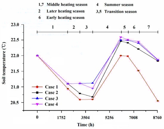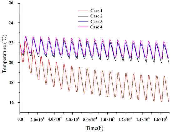 Figure 12 shows that the soil temperature varies periodically in 20 years. After the DES runs for 20 years, the soil temperatures of cases 1 to 4 decrease by 4.75, 0.80, 0.69, and 0.60 °C. The soil temperature decreases the most over time under case 1 compared with those of other cases. Given that cases 2, 3, and 4 have the operation of seasonal thermal storage for the ground soil, the trends of these cases are similar. Case 4 exhibits the best performance amongst all the cases.