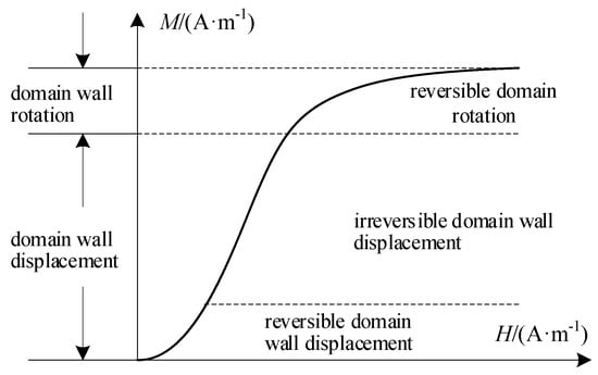The magnetization curves of most ferromagnetic materials show that the process from a magnetic neutral state to a magnetic saturation state includes domain wall displacement and magnetic domain rotation [,]. In a general situation, the magnetization process is generally divided into three stages. When external magnetic field is small enough, reversible domain wall displacement is the main structural change of the magnetic domain. With the enhancement of the external magnetic field, the Barkhausen jump happens. In this stage, irreversible domain wall displacement plays an important role. Moreover, hysteresis loss mainly occurs in this stage. In reversible domain wall rotation stage, the coil is behaving as if it is becoming an air-core [,,]. The magnetic domain structure curve of different magnetization stages is shown in Figure 2.