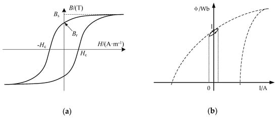 The irreversible nonlinear response of the magnetization to an imposed magnetic field is the essential characteristic of any ferromagnetic material. Due to the irreversibility of the magnetization process, when the external magnetic field is removed, the magnetic flux density cannot follow the magnetic field strength down to zero, and there is a time lag of the magnetic flux density behind the magnetic field strength [], which is the hysteresis, as shown in Figure 3a. Hysteresis is a property of ferromagnetic materials.