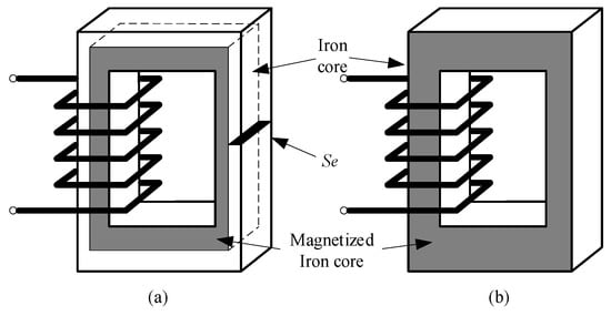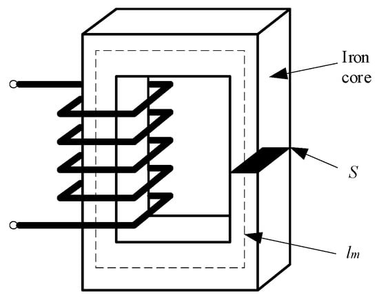where, μr is the relative permeability of the iron core, μ0 is the vacuum permeability, N is the number of the turns of the coil, S is the cross-sectional area of the iron core, and lm is the average magnetic path length. The path length and the cross-sectional area of an iron core without excitation are presented in Figure 4.