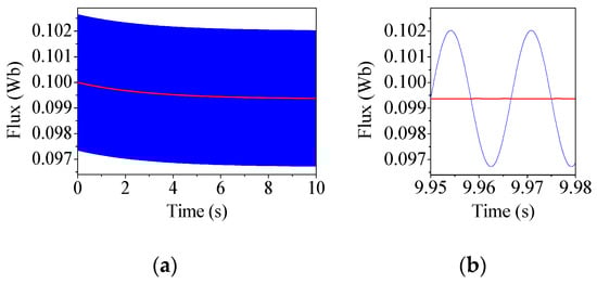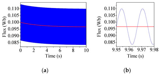 Figure 7 and Figure 8 are the magnetic flux curve when the residual flux is 0.1 Wb and the applied voltage is 1 and 5 V, respectively. In Figure 7 and Figure 8, b is the partial zoomed in figure a. One can appreciate that there is a flux offset due to the residual flux, and this flux offset gradually decreases. However, the amount of flux offset reduction is very small within 10 s. When the applied voltage is 1 and 5 V, respectively, the flux offset is reduced by approximately 1% and 4% in 10 s. In this case, the current Irms of the transformer excitation branch is about 5.3 and 26.5 mA (see Figure 9), which is 0.064% and 0.32% of the rated current of the transformer, respectively. Based on the discussions in Section 2, the imposed current is very small and it has neglected influence on the residual flux.
