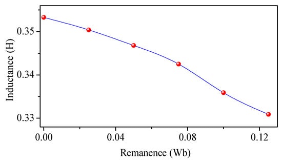 Table 3 presents the results of the magnetizing inductance under different residual flux when the test voltage changes from 2 to 5 V. The inductance–remanence curve under 1–5 V test voltage is shown in Figure 11. It can be seen that the variation of the magnetizing inductance with the change of residual flux is exactly the same as the case of 1 V. When the residual flux increases from zero to 0.125 Wb, the magnetizing inductance is reduced by about 6%. However, in the case of the same residual flux, when the test voltage changes from 1 to 5 V, the magnetizing inductance is basically unchanged. This shows that the magnetizing inductance is linear in the small signal region.