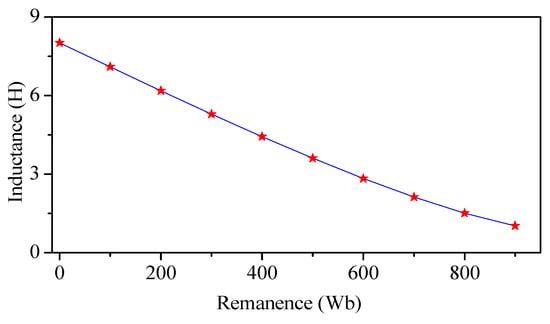 Figure 13 shows the inductance–remanence curve of the large power transformer obtained from the simulations. It can be seen that the magnetizing inductance decreases significantly with the increase of the residual flux. When there is no residual flux, the magnetizing inductance is 8.017 H; when the residual flux increases to 900 Wb, the magnetizing inductance reduced to 1.021 H, which is reduced 87.3%.
