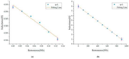 From the simulation results above, the inductance–remanence curves can be drawn by using low excitations on both small and large transformers. In this way, the residual flux can be determined through comparing the measured magnetizing inductance and the curves conveniently. In Figure 14, the two curves are compared for the fitting performance under the specified function. Since the change range of magnetizing inductance is different between the two kinds of transformers, a wider range of remanence–inductance curve can be measured on the large transformer. The large transformer shows a better fit for the liner function than the small one. Another key fact to remember, the sum squared residual of the large transformer is 7.69 × 10−4 and it is 7.27 × 10−6 on the small one, which means that the deviation can be ignored in both curves is small enough.