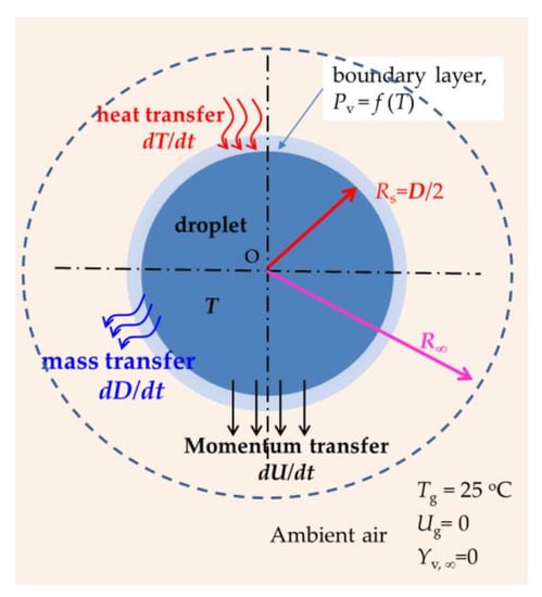 For single droplet evaporation, as schematically shown in Figure 1, we mainly consider mass, heat and momentum transfer between the droplet and the surrounding gas. The following assumptions are made to reduce the complexity of analysis: (1) the droplet is always spherical, (2) the droplet temperature is uniform throughout whole droplet but varies with time, (3) the liquid/gas interface is at local equilibrium and ambient gas is not soluble in droplet, and (4) the Soret and Dufour effects are ignorable and, finally, the radiation is neglected. Considering the mass diffusion and Stefan’s flow effect, the droplet vaporization rate dD/dt can be written as [1,20]: