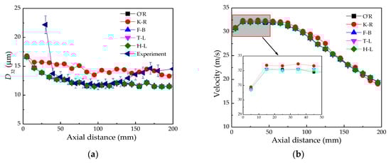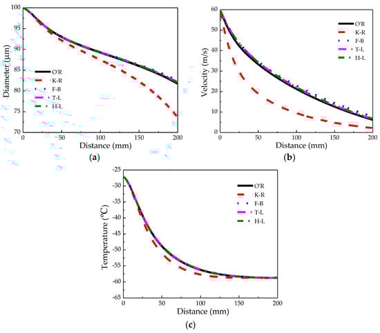 As for the droplet velocity variation shown in Figure 4b, all results of the different drag models also follow a similar trend in that the droplet velocity decreases along the distance due to the drag force acting on the droplet. The F–B model predicts a slightly higher velocity than the O’R, T–L and H–L models do. No difference can be found among the results predicted by the O’R, T–L and H–L models. However, the K–R model predicts a far lower droplet velocity and larger decreasing rate compared with the other four models.