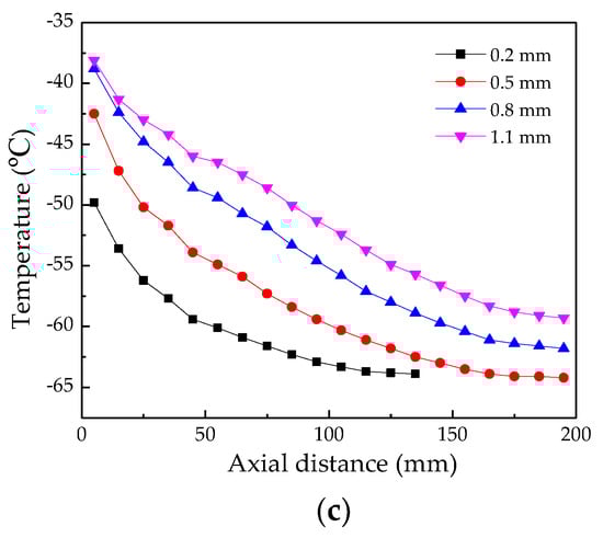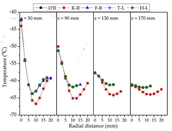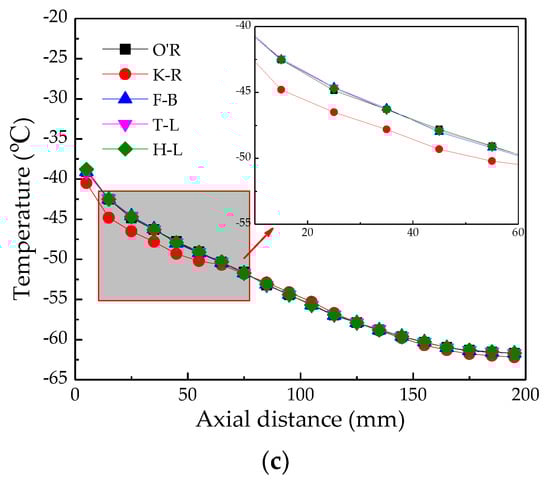 The variations of droplet temperature along the distance predicted by five models are shown in Figure 4c. Generally, the droplet temperature firstly shows an exponential decrease due to the high evaporation rate because of the high temperature. For droplet equilibrium evaporation, mass transfer only happens at the droplet surface. The gradient of the vapour mass on the droplet surface governs the magnitude of the mass transfer rate. Vapour concentration is calculated through the Clausius–Clapeyron equation [21], in which a higher droplet temperature causes a higher vapour concentration on the droplet surface. As is well known, evaporation needs to absorb heat, however, the heat transferred from the surrounding gas through convection cannot provide enough heat due to the rapid evaporation in the initial period. As a result, it absorbs heat from the remaining liquid of the droplet, leading to the rapid decrease in the droplet temperature. The decreasing droplet temperature in turn slows down the droplet evaporation rate and enhances the convective heat transfer due to the larger temperature difference between the droplet and the surrounding gas. This leads to a smaller magnitude in the droplet temperature decreasing rate. Finally, the droplet reaches its minimum temperature value once the latent heat of evaporation is completely balanced by the convective heat transfer. In contrast to the cases in the droplet diameter and velocity, the drag force models have less effect on the predictive temperature. The O’R, F–B, T–L and H–L models predict a nearly identical droplet temperature history with final minimum temperature of −59 °C. Although the K–R model predicts a slightly smaller droplet temperature from distances of 20–150 mm, it still predicts the same minimum temperature as those of the other models.