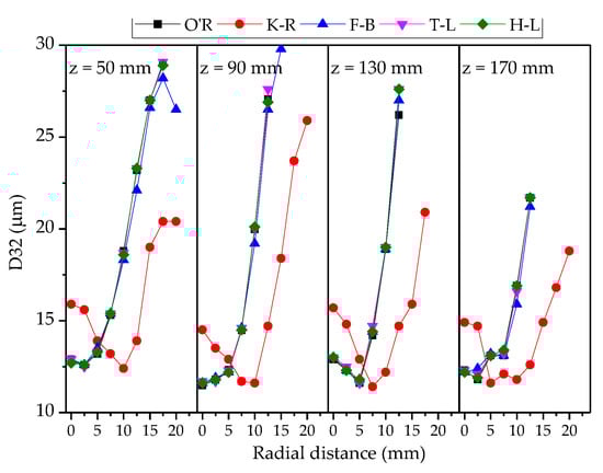 The radial variations of the droplet diameter, velocity and temperature at four spray sections (Z = 50, 90, 130 and 170 mm) of R134a flashing spray predicted by five drag force models are shown in Figure 6, Figure 7 and Figure 8. As shown in Figure 6, O’R, F–B, T–L and H–L models predict similar radial distributions. D32 presents a nearly monotonous increase with radial distance from the spray centre. This is probably due to the stronger shear force acting on droplets in spray centre than that at the spray periphery, which can be proved by Figure 7 that the spray centre has a much higher droplet velocity compared with periphery region. However, the K–R model predicts a “V” shape of the droplet diameter radial distribution, which is quite different from those by the other four models. Droplet diameter decreases firstly as the radial distance increases from the spray centre (R = 0). The minimum droplet diameter appears at a radial distance of around 10 mm, then the droplet diameter starts to increase with the radial distance.
