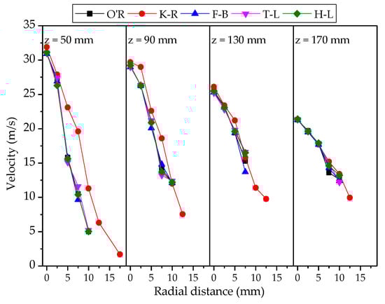 As shown in Figure 7, all five models predict similar radial distribution profiles of the droplet velocity. That is, the highest droplet velocity is located at the spray centre, and the droplet velocity decreases rapidly with the increase of the radial distance due to the more intense interaction between the droplet and ambient gases. The largest difference among the predictions still lies between results by the K–R model and those by other four models. That is, the K–R model predicts a higher droplet axial velocity along the radial distance than its counterparts do. This difference becomes smaller at farther distances. Compared with the relatively large difference in droplet diameter predictions, the drag force model has less impact on the predictions in the droplet velocity radial distribution.