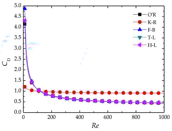 From above results of the performance of drag force models in predicting droplet evaporation for single R134a droplet and spray characteristics for R134a flashing spray, it can be concluded that the K–R model predicts different results than those by other four models and experiment. Therefore, we plot the variation of CD as a function of Re (<1000) from different drag force models. As can be seen from Figure 9, the K–R model predicts quite a different pattern compared with the others. That is, CD predicted by the K–R model varies very little with the Reynolds number ranging from 0 to 1000, while other models predict a rapid decrease in CD at low Re number. Therefore, a far lower value of CD at low Re number (<100) results while a larger value of CD results at a high Re number (>100) than those of the four other drag force models, which causes the discrepancy in the predictive results of the droplet evaporation and flashing spray.