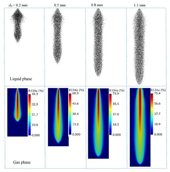 The previous experimental research has demonstrated that the nozzle diameter greatly influences the flashing spray characteristics and, thus, results in substantially different cooling performance [9] and influences nozzle flow and spray characteristics [32]. In this section, the effect of nozzle diameter of 0.2, 0.5, 0.8 and 1.1 mm on the spray characteristics of a R134a flashing spray has been investigated numerically using the O’R drag force model.