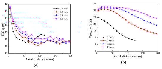 As shown in Figure 5b, the droplet axial velocity curves predicted by all models present quite similar profiles. In the first 50 mm away from the nozzle exit, the droplet velocity first experiences an acceleration period, which is a typical characteristic of flashing spray due to the explosion of the superheated liquid. Another possible explanation for the acceleration phenomenon is that the collapse of bubbles will result in a high-speed gas flow near the nozzle exit. The high-speed gas certainly accelerates the low-speed droplets until their velocities are the same. As noticed during the acceleration region, the K–R model generates the highest axial velocity among the five models. No obvious difference can be found in the simulated results by the other four models. The droplet axial velocity starts to decline due to the drag force once the superheat is completely released in the region of 50 mm. Unlike the other four models predicting a near linear decrease, the slope of the droplet axial velocity in K–R drag model fluctuates a great deal along the axial distance.
