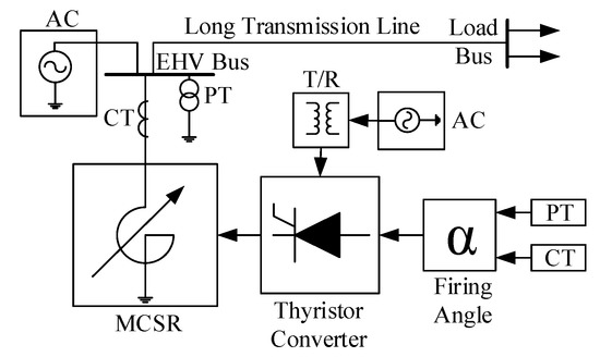 where and is the total magnetic field strengths of limb 1 and limb 2 of phase A, respectively. While, and represent the DC and AC magnetic field strengths, respectively. Equations (5) and (6) show that by changing the DC magnetic field strength, the desired saturation level of the limbs can be achieved. From Equations (5) and (6), it is clear that increasing can increase the which in turn can decrease the . By decreasing results in the increase of inductive reactance of an MCSR. As a result, the reactive power consumption of an MCSR increases and hence its capacity. The can be varied by changing the firing angle of the thyristor convertor according to real time reactive power measurement from EHV bus and the terminal side of the reactor. The detailed operational closed-loop diagram of an EHV bus-connected MCSR is shown in Figure 1.