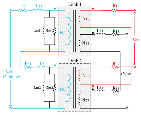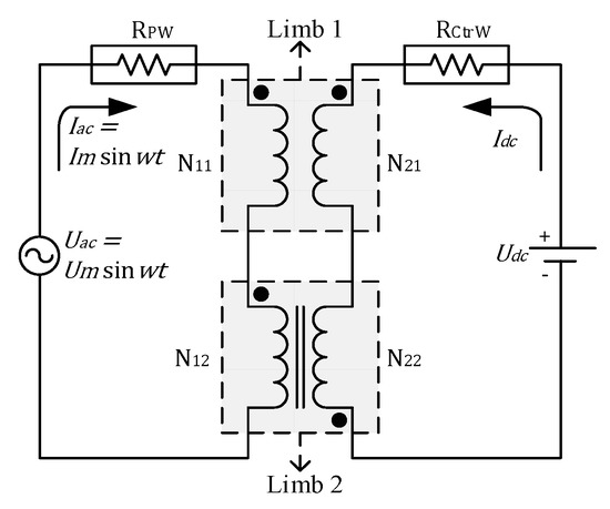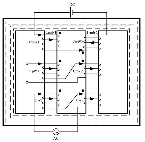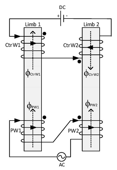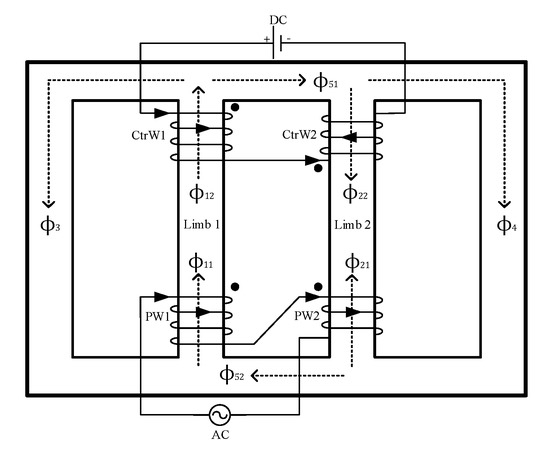 As shown in Figure 8, both AC and DC sources are applied across the same limbs of MCSR through PWs and CtrWs, respectively. Therefore, the magnetic field strength of limb 1 and limb 2 of three-phase MCSR phase A can be written as: