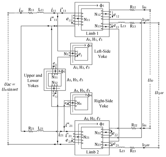 The arrangement of PWs and CtrWs across the limbs of single-phase of a three phase MCSR and their connectivity is shown in Figure 5. The flux representation inside limbs, upper yoke, and lower yoke is shown in Figure 5 by neglecting the effect of CpW. The AC flux due to PWs is represented by and , and DC flux of CtrWs is represented by and , respectively. The rest of the fluxes indicate left-side yoke (), right-side yoke (), upper yoke (), and lower yoke (), respectively. The two limbs are modelled as two three-winding transformers. Figure 6 shows the main magnetic flux paths of the limbs while ignoring the effect of flux in the yokes. The equivalent electrical circuit diagram of the above configuration is given in Figure 7.
