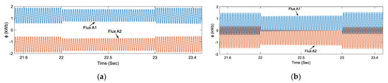 AC flux A1 () and flux A2 ( ) during a 3% PW T2TF in limb1 of phase A under (a) 100% capacity; and (b) 10% capacity.