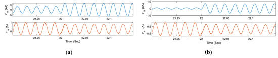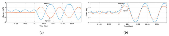 Equation (19) shows that the magnitude of induced voltage across a winding is directly proportional to the inductance of the winding and instantaneous rate of change of current. In case of a T2TF in , shortening of few turns will cause the main AC flux ( and to decrease and the leakage flux will rise. This decrease of main flux A1 and A2 is shown in Figure 9a,b for 3% PW T2TF under 100% operating capacity applied from 22 to 23 seconds of the simulation time. The drop of main AC flux will also cause the AC excitation and magnetization currents to decrease. As, CtrWs and CpWs are also wound on the same limb and having much smaller number of turns than PWs ( for and ), therefore, a small change in the main flux due to T2TF in PW will cause a huge impact on electrical parameters of these windings as shown in Figure 9, Figure 10, Figure 11 and Figure 12. Additionally, a visible change in current at EHV bus can be seen in Figure 13. In case of a PW T2TF, a demagnetizing current will start flowing due to the opposing flux according to Lenz’s law, draw more current and will act as a load.