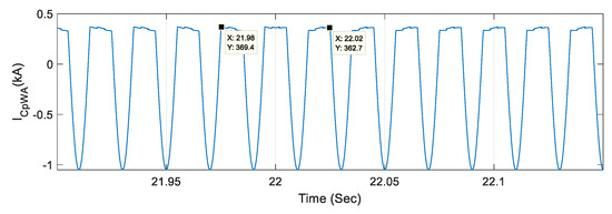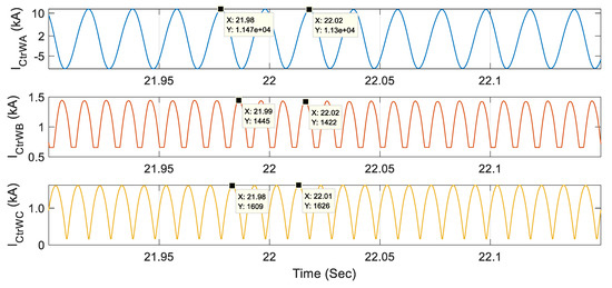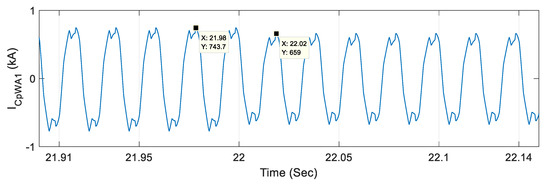 As delta connected CpWs are not connected directly to any kind of power sources, and only the harmonic contents of are circulating in it, therefore, the effects of CpW T2TF resemble PW T2TF. Under 3% CpW T2TF, there are small changes occuring in the CtrWs waveforms, as shown by the data cursor in Figure 20, and phase A of CpW as shown in Figure 21. The detailed simulation results of all the input currents for 3% CpW T2TF under 10% and 100% operating capacities are given in Table 5 and Table 6. To detect a 3% T2TF in CpWs under 10–100% operating capacity, is found sensitive to these kind of faults. During normal and steady-state conditions, the magnitude remains almost positive (with −12A sinusoidal) while, in case of a 3% T2TF, its magnitude changes to higher negative values (−26A increases in both cases for 10% as well as 100% operating capacity). The higher magnitude values in negative show that either T2TF or energization of the equipment occurred. Now, the issue is to differentiate between T2TF and energization conditions. For this purpose, simulations of all possible energization conditions are carried out, and the results are depicted in Table 5 and Table 6 (where normal steady-state condition is represented by blue, energization by black, and T2TF by red color). From the simulation results, it is evident that during energization the increase in magnitude of CtrW is a fixed percentage (69%) of the original and is continuously decaying with time, which is easily distinguishable from T2TF. During 10% operating capacity, it will take longer (i.e., 6.5 s) to settle as compared to 100% operating capacity (i.e., 3 s). As these phenomena will only happen in the CtrW of the affected phase, therefore, phase selection is also performed.