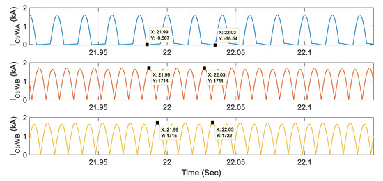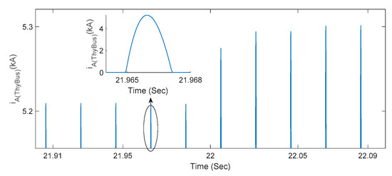 Figure 15 shows the complete module of MCSR CtrW and its DC excitation system for changing the firing angles of thyristors. In Figure 16, the connectivity of the CtrWs with the DC buses and the balance resistors is represented separately. Due to a T2TF in CtrWs, the saturation of the limbs will be affected because, an extra DC current will circulate in the faulted section and therefore, a slight increase in the capacity of MCSR can be noticed due to this extra DC current. Due to the huge difference in number of turns from PWs, there will be no visible effect on PW side current (only 4 Amp increase) for 3% CtrW T2TF under 10% operating capacity. However, under 50% and 100% operating capacities, the change is noticeable. Figure 17 shows the changes in CtrW current () of each phase when a T2TF of 3% is applied at limb 1 of phase A at 22 Second. The data cursor in the waveforms represents current values before and after the fault occurrence. Due to this fault, a reasonable change in limb 1 of phase A CpW current () is also noted as shown via data cursor in Figure 18. Table 3 and Table 4 show the detailed input currents of all the windings for 3% CtrW T2TF under 10% and 100% operating capacities. However, these changes in PW and CpW is no more detectable when the operating capacity becomes less than 50% and a 3% CtrW T2TF occurs. For this purpose, the only criteria for detecting T2TF is the current at thyristor bus (). Figure 19 shows this change in current after applying fault at 22 second. For CtrW T2TF detection, power winding current, compensation winding current, and are selected due to their sensitivities. When the operating capacity is 50% to 100% and a 3% T2TF occurs, and of the affected phase and limb is selected to detect the changes in its magnitude. However, for 10% operating capacity, only is sensitive. In both cases (i.e., 50–100%, and 10% capacity), the changes in affected winding is investigated and therefore can be further used for faulty-phase selection. The detailed results of the simulations are given in Table 3 and Table 4. For energization, internal faults, and external faults the behavior of the current completely changed (as shown in Table 3 and Table 4, where normal steady-state condition is represented by blue, energization by black, and T2TF by red color). It is worth noting to mention that, during 3% T2TF at 50% or more capacity, the goes on increasing while that of goes on decreasing, respectively. However, in both cases the problem of differentiation between energization condition and that of a T2TF exists. For solving this issue, the detailed simulation study is performed and found that the ratio of steady-state to energization condition is up to 59% and disappear after 2.5–3 s. For this ratio reaches up to 75% and the decaying time remains from 3–5 s for 10–100% operating capacity, respectively. During 3% T2TF under 100% capacity, the increase in is almost 10A and the decrease in is noted 80A. Using both these criteria, a 3% T2TF can be detected along with its faulty-phase identification. For CtrW to Ground fault, the behavior of both these winding currents reversed, i.e., goes on decreasing while that of goes on increasing. Under 10% operating capacity, the only criterion for 3% T2TF detection is . The increase in under this case is noticed more than 100A, and hence easily detectable. Considering magnitude of , T2TF during any circumstance of energization condition is easily distinguishable.