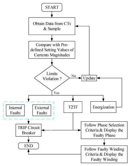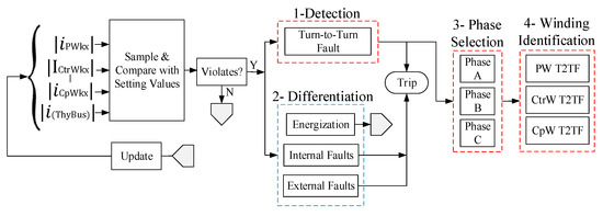 Based on the above analysis, a protection scheme is proposed for each winding keeping in mind their special features and the detectable changes in the magnitude of their respective current during T2TFs. In Figure 22, the flowchart of the proposed protection scheme is shown. After getting the CTs data from input terminal of all the three windings and the thyristor bus, the magnitudes comparison of , , , and is performed. In case of normal operation or energization condition, the memory will be updated without any further action. However, if there is limits violation happened, then it should be differentiated between internal PW-to-ground fault, external phase-to-phase or phase-to-ground, and T2TFs. In all these conditions, the first step will be to operate the relay and trip the circuit breaker to isolate the faulty section. Only in case of a T2TF, the faulty phase and faulty winding criteria will be followed to identify it, based upon the abnormal range values of faulty section.