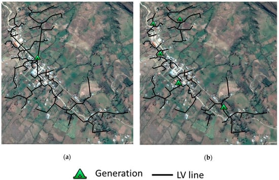 Consumers grouped in (a) one, and (b) five mini-grids. The network designs of the mini-grids were calculated with Reference Electrification Model (REM). Map data: Google, CNES/Airbus.