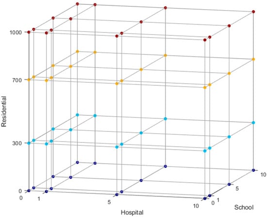Each type of load is assigned a demand profile to develop this procedure. This allows expressing each mini-grid as a combination of its types of loads, and the representative mini-grids are the vertices of a rectangular mesh where the interpolation and extrapolation procedures are performed. Figure 3 shows an example with three types of loads, where the representative mini-grids are obtained as combinations of 0, 300, 700, and 1000 residential consumers, 0, 1, 5, and 10 hospitals, and 0, 1, 5, and 10 schools. REM would calculate generation designs for 4 × 4 x 4 = 64 representative off-grid systems, which correspond to the points in the figure.