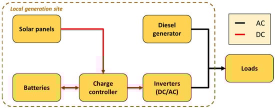 Figure 4 shows the architecture that REM considers for off-grid systems. Note that only solar energy is currently used as a renewable source, but other sources such as wind, mini-hydro, and biomass are under analysis, and they could be integrated similarly in the optimization process.