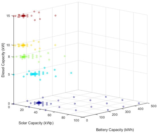 Candidate generation designs that the algorithm considers. As the diesel capacity increases, candidate designs have fewer solar panels and batteries.