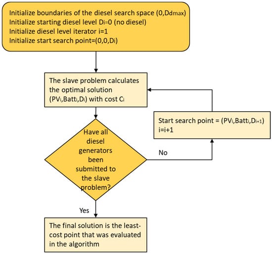 Figure 6 shows the flow diagram of the master problem. The master problem performs an exhaustive search as it goes through all the available diesel generators in the diesel search space, which may consume a significant amount of time.