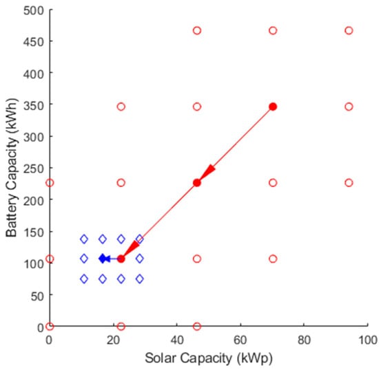 Flow diagram of the slave problem. The upper boundaries of the solar and battery search spaces are defined as ten times the average demand.