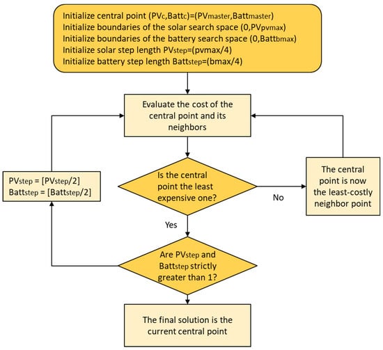 The algorithm presented in this section considers a tridimensional search space where each axis corresponds to one off-grid technology (solar, diesel, and battery storage), optimizing their respective capacities. The charge controller and the inverter that better suit the design, if needed, are selected afterwards.