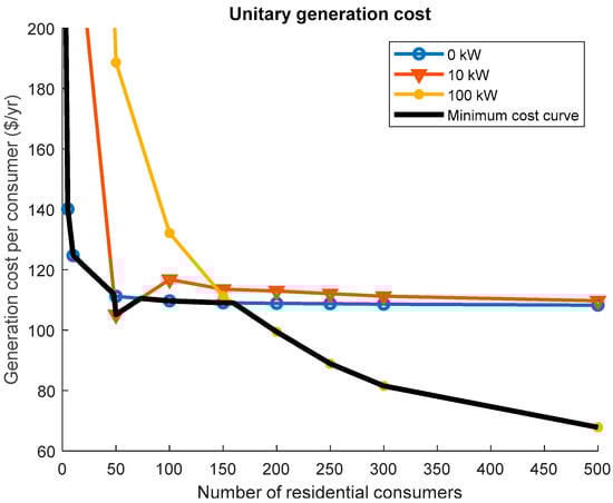 Figure 9 shows the minimum cost per consumer for these representative combinations of residential consumers, showing the partial optima obtained for the three diesel options (0, 10, and 100 kW) and the minimum cost curve (i.e., the minimum-cost design for each point).