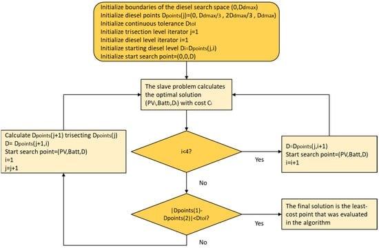 It can be concluded from Section 3.2 that the use of discrete diesel generators in the master problem is problematic, and the computation time that the master problem needs to go through all the generators in the diesel space may be excessive for large mini-grids. Hence, we propose a new logic for the master problem that treats the diesel capacity as a continuous variable. The search is performed by trisecting an interval (i.e., dividing an interval into three segments of the same length with four points), which is shortened, discarding the diesel capacity that is further from the current best design and trisected again. The process continues until the length of the interval is lower than a pre-specified tolerance. The slave problem presented in Section 3.2 has performed well so far, so it has not been necessary to modify it.