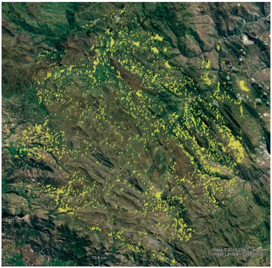 The method presented in Section 3 was applied to a case study located in the region of Cajamarca, in Northern Peru. This region has an area of approximately 400 km2, around 6700 buildings, and several potential connection points to the projected network of 11 kV. The Ministry of Energy and Mines approved the National Plan for Rural Electrification in Peru, which has the goal of achieving universal access by the end of 2022.