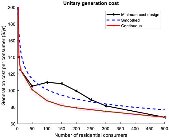 Figure 14 shows the minimum cost design curve (obtained with the algorithm described in Section 3.1 and performing linear interpolation), the smoothed curve (obtained applying the procedure described in Section 3.2 to the minimum cost design curve), and the continuous results (obtained with the method presented in Section 3.3 and performing linear interpolation). The continuous implementation better captures the trend of economies of scale in generation.