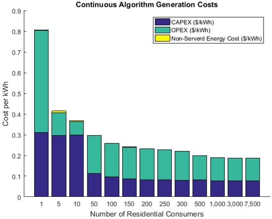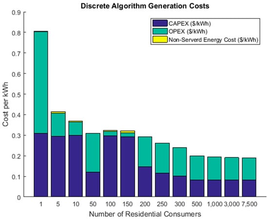 Figure 15 and Figure 16 show the cost breakdown of the generation designs obtained with discrete and continuous diesel capacities, respectively. As expected, designs that included a diesel generator had an OPEX that accounted for a much more significant amount of the generation cost. This effect especially stands out in Figure 15 as the design for 50 consumers includes a 10 kW diesel generator but designs for 100 and 150 residential consumers do not include a diesel generator.